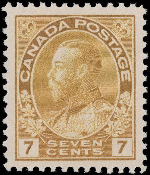 1912, King George V "Admiral", 7¢ yellow ocher (Scott 113), a gorgeous mint single, exceptionally fresh and beautifully centered with gorgeous color, Extremely Fine, with a 2025 P.S.E. certificate graded XF 90. Unitrade C$270 ($200). SMQ $165. Scott $130. (Image)
