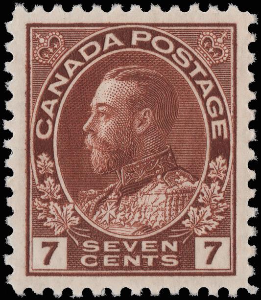 1924, King George V "Admiral", 7¢ red brown, dry printing (Scott 114), an exceptional mint single, o.g., never hinged, post office fresh and perfectly centered with fabulous color, Extremely Fine to Superb, with a 2018 P.S.E. certificate graded XF-SUP 95. Unitrade C$105 ($80). 140. Scott $65. (Image)