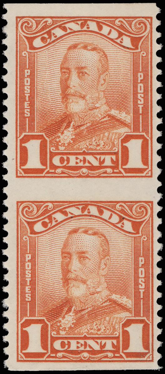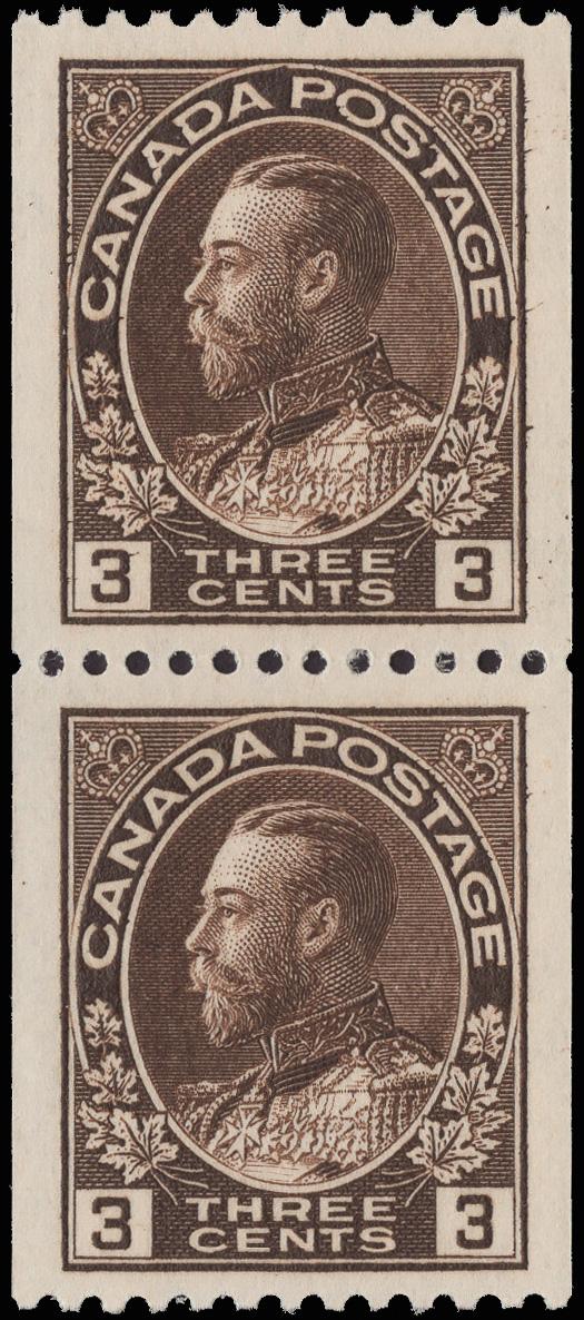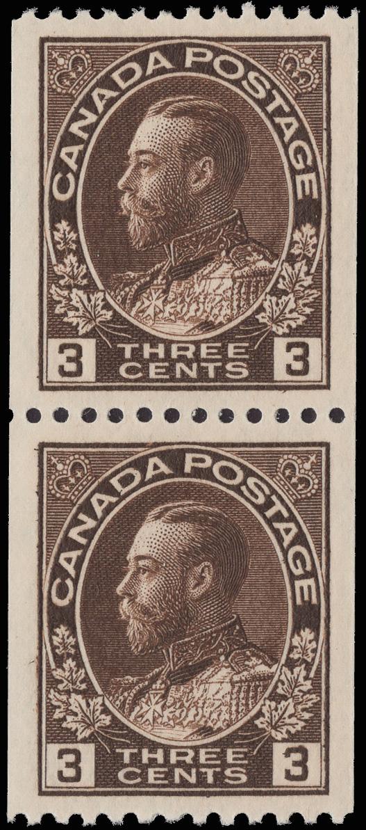 1921, King George V "Admiral", 3¢ brown, vertical coil, perf. 12 horizontally (Scott 134), an exquisite mint pair, wonderfully bright and fresh with both stamps mathematically centered, Superb. Amazing! SMQ prices only singles, the highest grade being XF-Sup 95 ($65 each), with a 2024 P.S.E. certificate graded SUP 98. Unitrade C$100 ($70). Scott $70. (Image)
