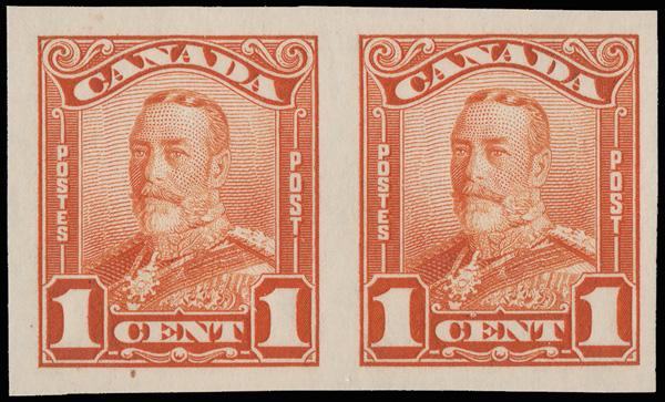 1928, King George V "Scroll", 1¢ orange, imperf (Scott 149b), horizontal pair, o.g., never hinged, large margins and bright color, Very Fine to Extremely Fine. 250 pairs belived to exist., with a 2018 P.S.E. certificate graded VF-XF 85. Scott $125. (Image)