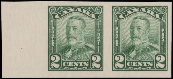 1928, King George V "Scroll", 2¢ green, imperf (Scott 150b), a choice left sheet margin horizontal pair, o.g., never hinged, bright and fresh with large margins, Extremely Fine. Only 250 pairs estimated to have been available., with a 2018 P.S.E. certificate graded XF 90. Unitrade C$193 ($140). Scott $125. (Image)
