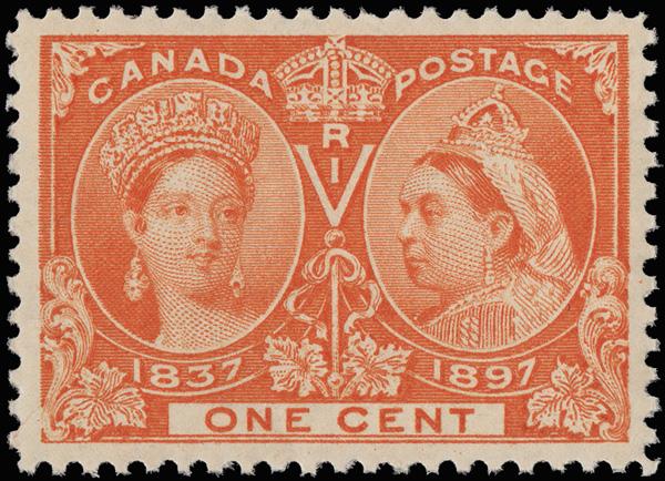 1897, Queen Victoria Jubilee, 1¢ orange (Scott 51), a phenomenal mint example, o.g., never hinged, incy fresh with ccen and blazing color, Extremely Fine to Superb. Unitrade C$120 ($90). Scott $75. (Image)