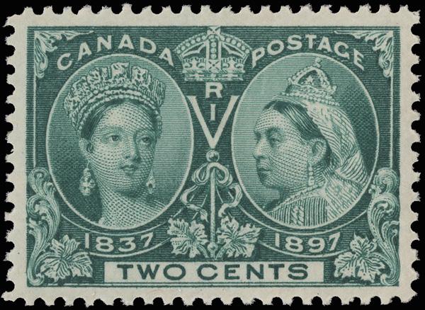 1897, Queen Victoria Jubilee, 2¢ green (Scott 52), o.g., never hinged, virtually perfectly centered, fresh and choice, Extremely Fine, with a 2018 C.P.E.S. certificate graded "95". Unitrade C$150 ($110). Scott $93. (Image)
