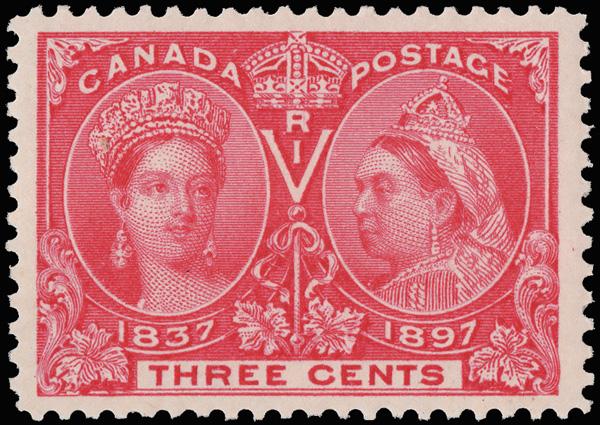 1897, Queen Victoria Jubilee, 3¢ bright rose (Scott 53), o.g., never hinged, bright, fresh and very well centered, Very Fine to Extremely Fine, with a 2019 P.S.E. certificate graded VF-XF 85,. SMQ VF-XF 85; $80. Scott $75. (Image)