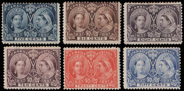 1897, Queen Victoria Jubilee, 5¢-10¢, 20¢ & 50¢ (Scott 54-57, 59-60), o.g., heavily hinged, except the 5¢ without gum, all bright and fresh, but not particularly well centered; 10¢ with a small tear at the top, otherwise about Fine. Scott $1,270. (Image)