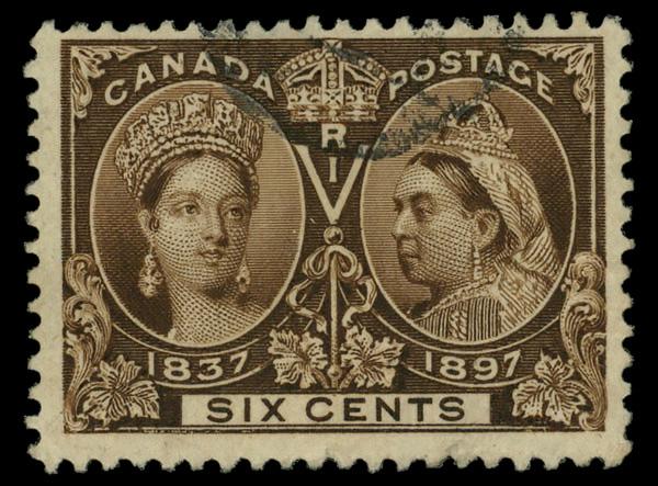 1897, Queen Victoria Jubilee, 6¢ yellow brown (Scott 55), Fine to Very Fine. Scott $175. (Image)