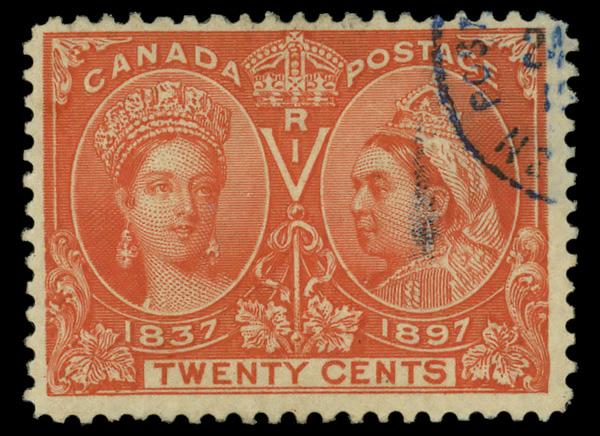 1897, Queen Victoria Jubilee, 20¢ vermilion (Scott 59), Fine to Very Fine. Scott $175. (Image)