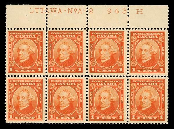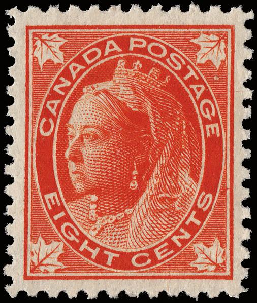 1897, Queen Victoria "Maple Leaf", 8¢ orange (Scott 72), a choice mint example, o.g., never hinged, beautifully centered with extraordinary color, Extremely Fine. Unitrade C$1,350 ($1,000). Scott $850. (Image)