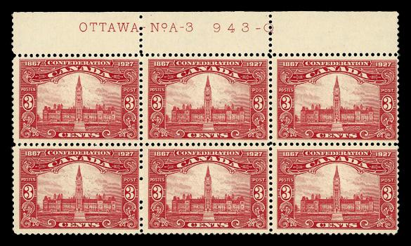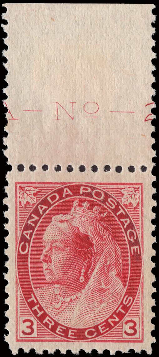 1898, Queen Victoria "Numeral", 3¢ carmine (Scott 78), a choice top sheet margin single with faint plate" No. 2", wonderfully fresh and beautifully centered, Extremely Fine, with a 2021 Crowe certificate. Unitrade C$450 ($330). Scott $220. (Image)