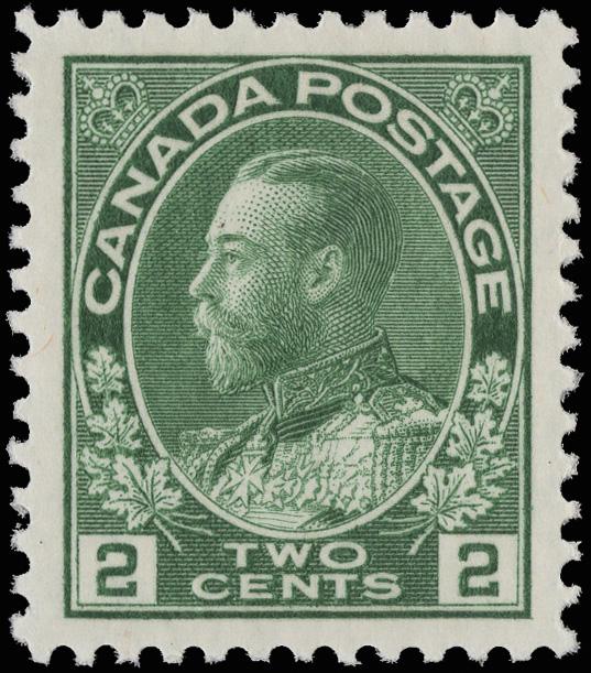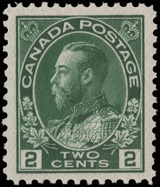 1923, King George V "Admiral", 2¢ green, dry printing (Scott 107e), an extraordinary mint single, o.g., never hinged, bright and fresh and mathematically centered, Superb. 107e is unpriced by SMQ, with a 2019 P.S.E. certificate graded GEM 100. Unitrade C$90 ($70). Scott $50. (Image)