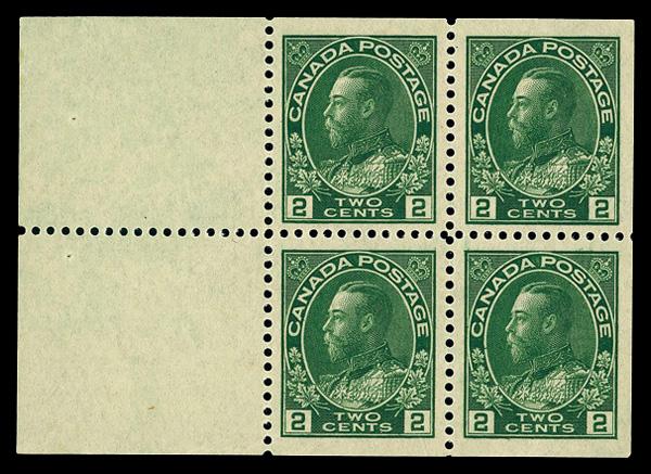 1922, King George V "Admiral", 2¢ yellow green, booklet pane of 4 + 2 labels (Scott 107b), o.g., never hinged, Very Fine to Extremely Fine. Scott $140. (Image)