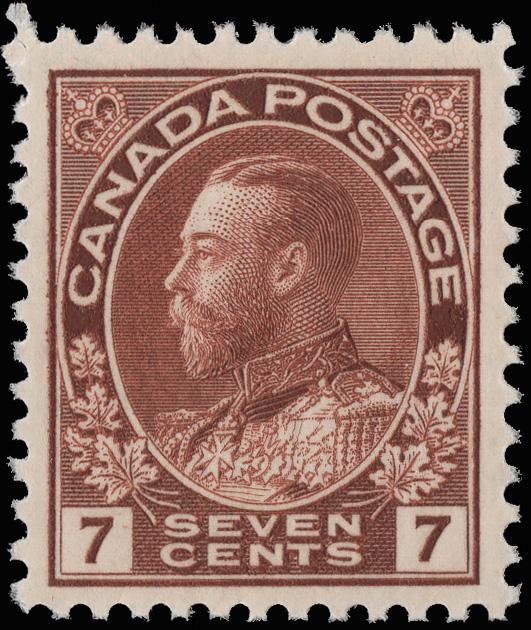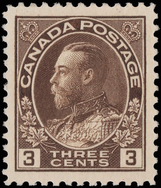 1918, King George V "Admiral", 3¢ brown, wet printing (Scott 108), a gorgeous mint single, o.g., never hinged, wonderfully fresh and perfectly centered, Extremely Fine, with a 2018 P.S.E. certificate graded XF 90. Unitrade C$150 ($110). Scott $65. (Image)