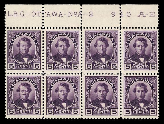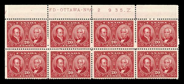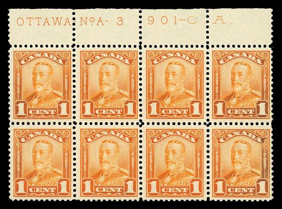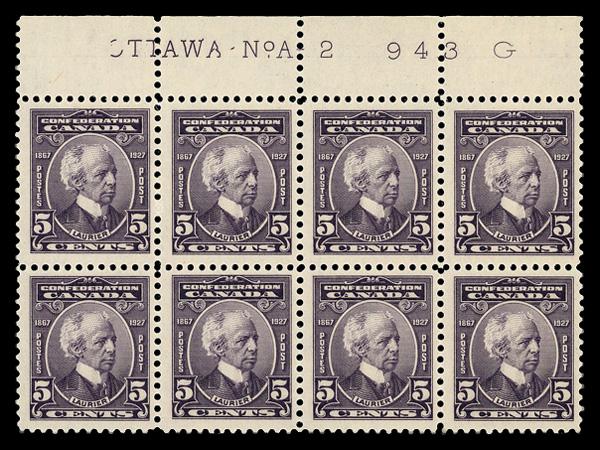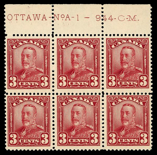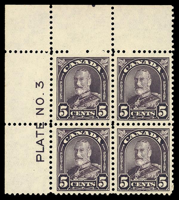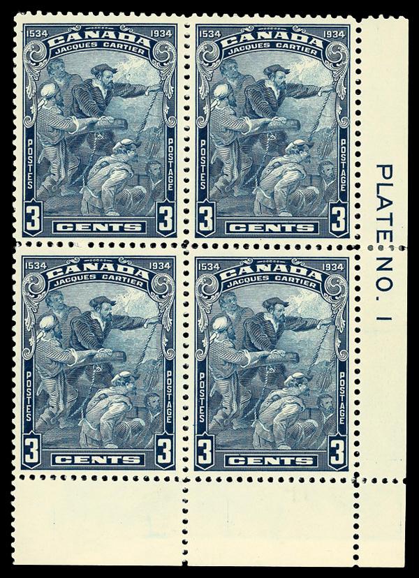 1934, 3¢ Jacques Cartier, "hairline from hand" variety (Unitrade 208iii), plate block of 4, o.g., small hinge remnant in selvage, Very Fine. Scott 208 var. Unitrade C$175 ($130). (Image)