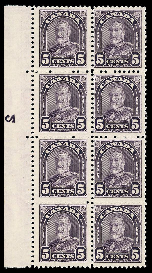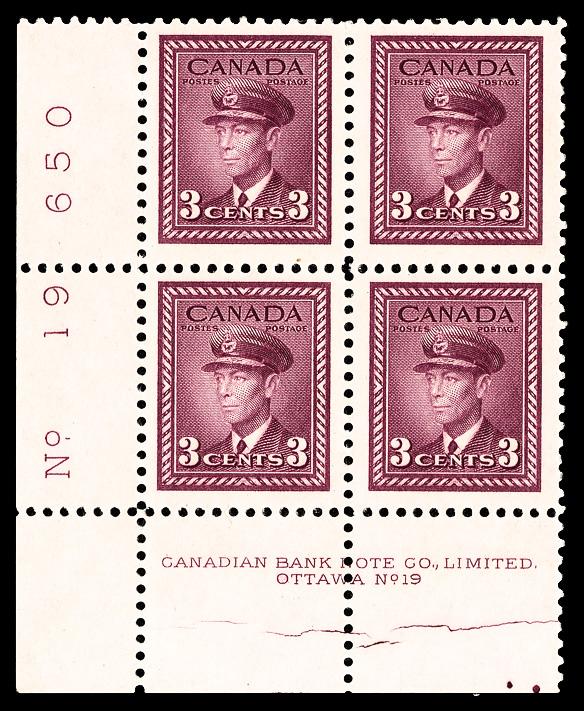 1943, King George VI, 3¢ rose violet, cracked plate variety (Scott 252 var.), plate block of 4, o.g., never hinged, Very Fine to Extremely Fine. Unitrade 252; C$225 ($170). (Image)