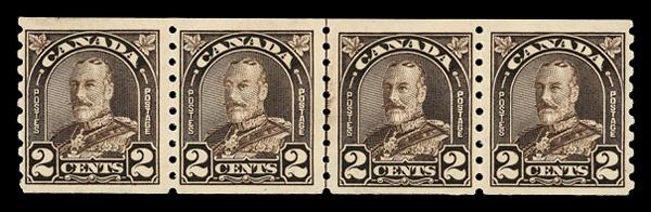 1931, King George V "Maple Leaf", 2¢ dark brown, horizontal coil, perf. 8½ vertically, joint line strip of 4, 'Cockeyed King' variety, slightly disturbed o.g., Fine to Very Fine. Unitrade 182iii; C$145 ($110). (Image)