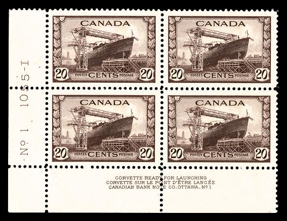 1942, 20¢ Corvette (Scott 260), plate block of 4, o.g., never hinged, Extremely Fine to Superb. Scott $78. (Image)