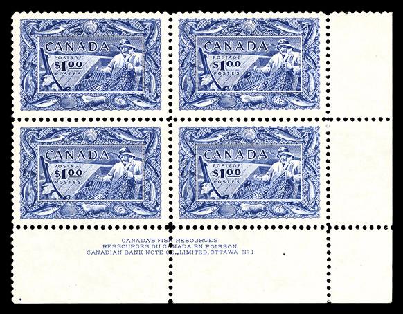 1951, $1 Fisheries (Scott 302), plate block of 4, o.g., never hinged, Superb. Scott $175. (Image)
