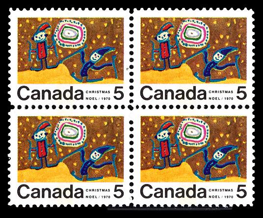 1970, 5¢ Christmas (Children Skiing), tagged (Unitrade 522pi), center block of 4, o.g., never hinged, Extremely Fine to Superb. Scott 522 var. Unitrade C$200 ($150). (Image)