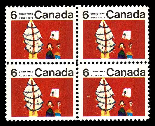 1970, 6¢ Christmas (Christmas Tree & Children), tagged, center block of 4, Extremely Fine. Unitrade 525pi; C$200 ($150). (Image)