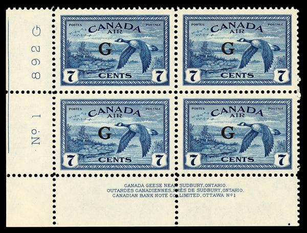 Airmail Official, 1950, 7¢ deep blue, "G" (Scott CO2), plate block of 4, o.g., never hinged, Superb. Scott $85. (Image)