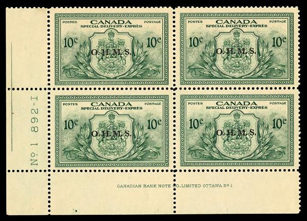Special Delivery Official, 1950, 10¢ green, "O.H.M.S." (Scott EO1), plate block of 4, o.g., never hinged, Very Fine. Scott $63. (Image)