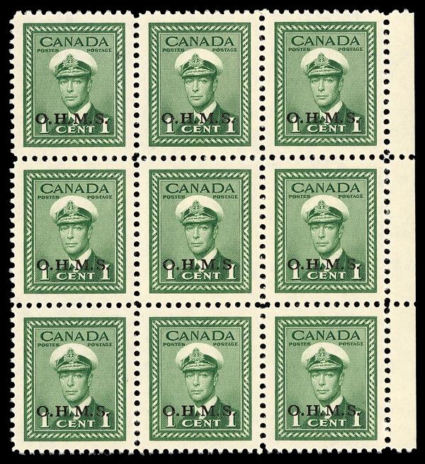Official, 1949, 1¢ King George VI, "O.H.M.S." overprint, no period after "S" (Scott O1a), block of 9, variety on the center stamp., o.g., never hinged, Superb. Scott $239. (Image)