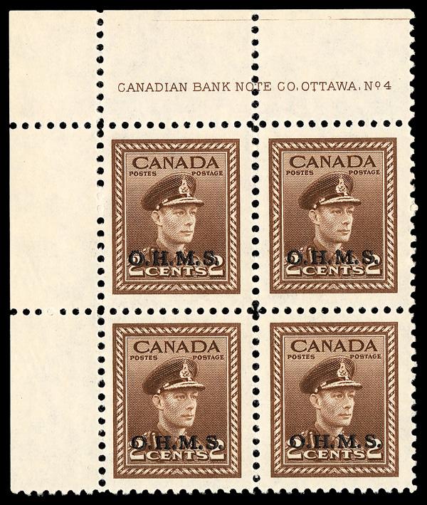 Official, 1949, 2¢ King George VI, "O.H.M.S." overprint (Unitrade O2), UL plate block of 4 plate #4, o.g., never hinged, Extremely Fine to Superb. Unitrade C$125 ($90). (Image)