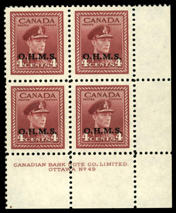 Official, 1949, 4¢ King George VI, "O.H.M.S." overprint (Unitrade O4), LR plate block of 4 plate #49, o.g., never hinged, Superb. Unitrade C$300 ($220). (Image)