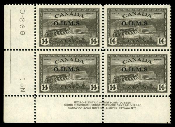 Official, 1949, 14¢ Hydroelectric Plant, "O.H.M.S." overprint, no period after "S" (Scott O7a), plate block of 4, variety on the LR stamp., o.g., never hinged, Extremely Fine to Superb. Scott $158. (Image)