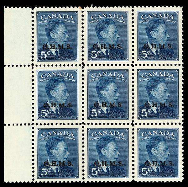Official, 1950, 5¢ King George VI, "O.H.M.S." overprint, no period after "S" (Scott O15Ac), block of 9, variety is on center stamp, o.g., never hinged, Extremely Fine to Superb. Scott $130. (Image)