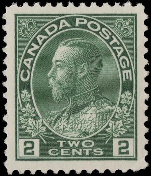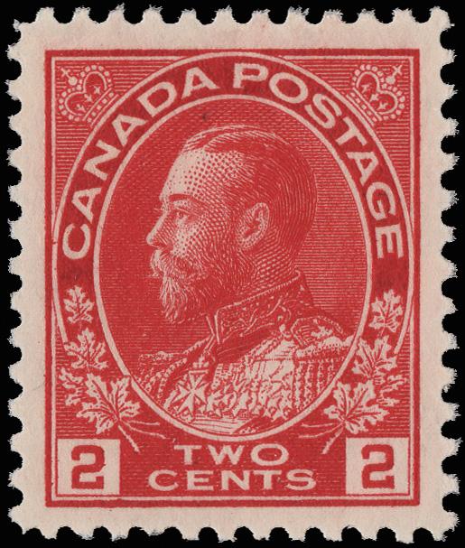 1912, King George V "Admiral", 2¢ carmine (Scott 106), o.g., never hinged, bright, fresh and beautifully centered. Unitrade C$120 ($90). SMQ $75. Scott $65. (Image)