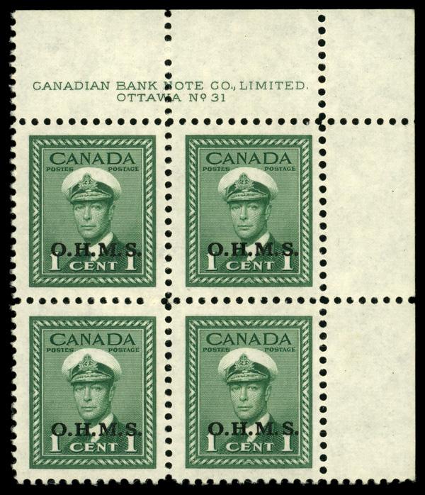 Official, 1949, 1¢ King George VI, "O.H.M.S." overprint (Unitrade O1), UR plate block of 4 plate #31, o.g., never hinged, Extremely Fine. Unitrade C$180 ($130). (Image)
