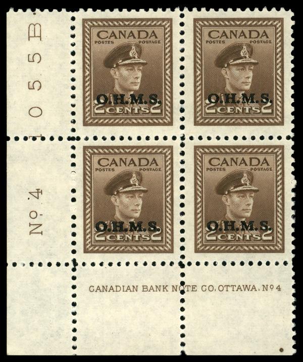 Official, 1949, 2¢ King George VI, "O.H.M.S." overprint (Unitrade O2), LL plate block of 4 plate #4, o.g., never hinged, Extremely Fine. Unitrade C$150 ($110). (Image)