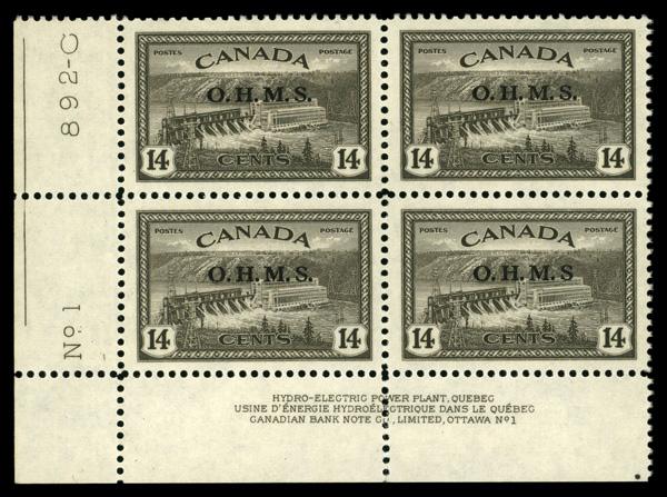 Official, 1949, 14¢ Hydroelectric Plant, "O.H.M.S." overprint, no period after "S" (Scott O7a), plate block of 4, variety on the LR stamp., o.g., never hinged, Extremely Fine to Superb. Scott $158. (Image)