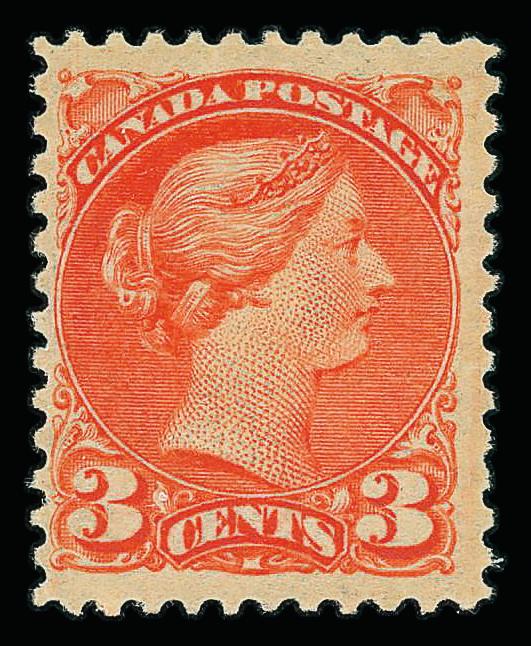 1888, Small Queen, 3¢ bright vermilion (Scott 41), single, o.g., never hinged, Fine to Very Fine. Scott $135. (Image)