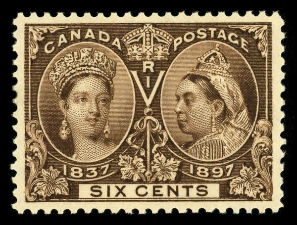 1897, Queen Victoria Jubilee, 6¢ yellow brown (Scott 55), o.g., never hinged, Very Fine. Scott $625. (Image)