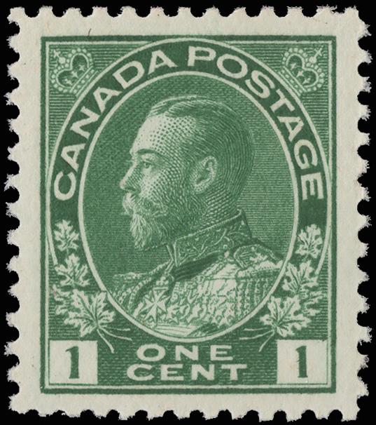 1912, King George V "Admiral", 1¢ dark green (Scott 104), o.g., never hinged, bright, fresh and virtually perfectly centered, Extremely Fine to Superb, with a 2020 P.S.E. certificate graded XF-SUP 95. Unitrade C$120 ($90). SMQ $150. Scott $65. (Image)