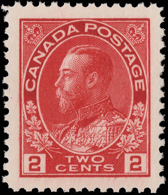 1912, King George V "Admiral", 2¢ carmine (Scott 106), a gorgeous, extra large margined single, o.g., never hinged, bright, fresh and virtually perfectly centered, Extremely Fine to Superb. SMQ does not price any grade higher than XF-Sup 95, with 2025 P.S.E. certificate graded XF-SUP 95J. Unitrade C$120 ($90). 140 for a normal XF-Sup 95. Scott $65. (Image)