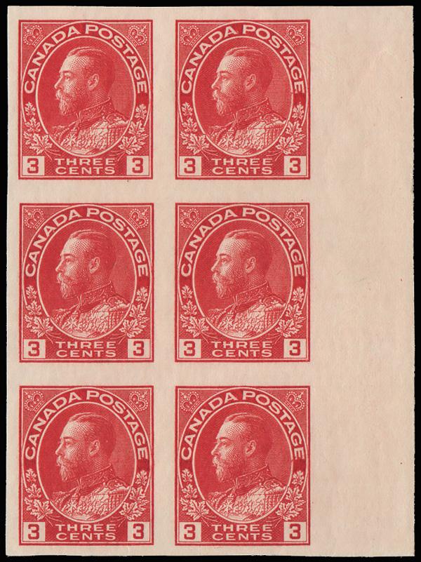 1924, King George V "Admiral", 3¢ carmine, imperf (Scott 138), right sheet margin block of 6, o.g., never hinged, Very Fine to Extremely Fine. Scott $210 as pairs. (Image)