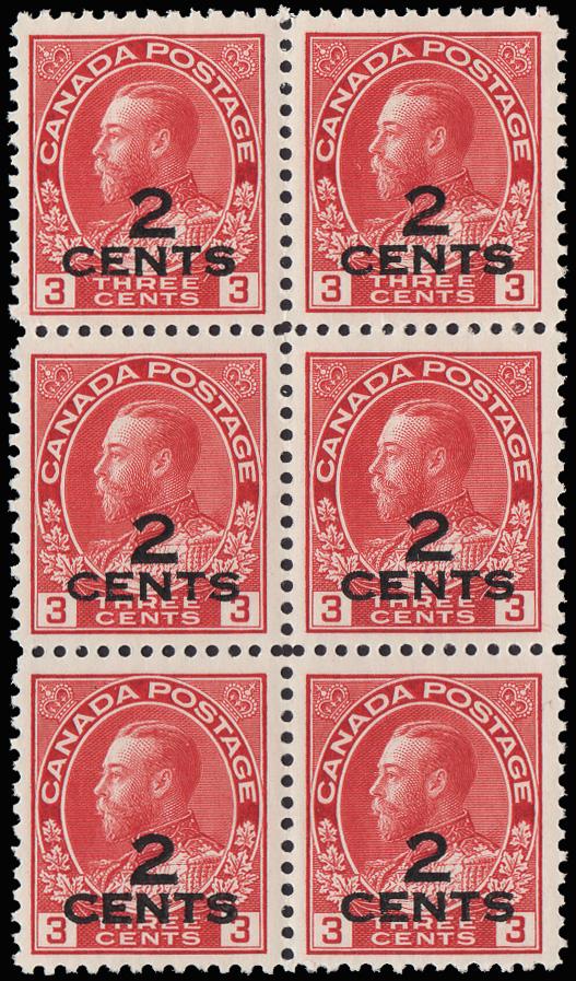 1926, King George V "Admiral", 2¢ on 3¢ carmine (Scott 140), a fresh, nicely centered block of 6, o.g., never hinged, Very Fine, with a 2019 P.S.E. certificate. Scott $405 as singles. (Image)