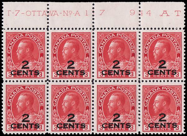 1926, King George V "Admiral", 2¢ on 3¢ carmine (Scott 140), an outstanding top Plate No.-A-117 block of 8, o.g., very lightly hinged (six stamps never hinged), wonderfully fresh very well centered, Very Fine. Scott $460 as singles. (Image)