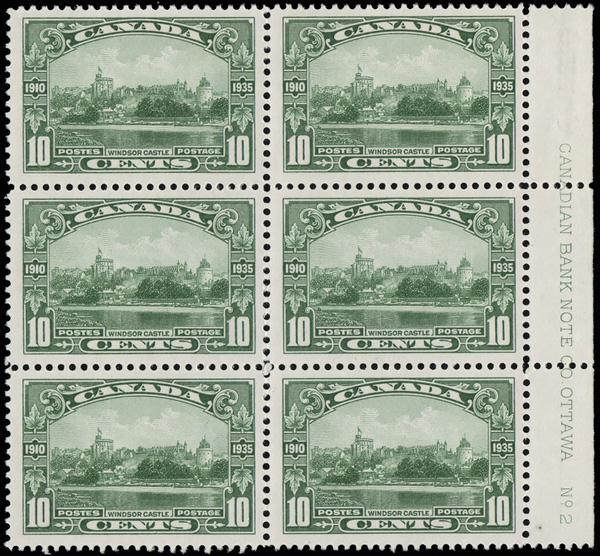 1935, 10¢ Windsor Castle (Scott 215), right Plate No. 2 block of 6, o.g., never hinged, fresh and well centered, with a 2022 P.S.E. certificate. Scott $90. (Image)