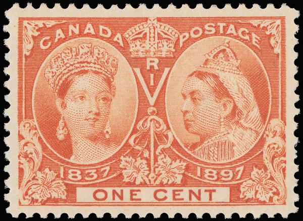 1897, Queen Victoria Jubilee, 1¢ orange (Scott 51), o.g., never hinged, virtually perfectly centered with brilliant color; single nibbed perf at the right per accompanying certificate, otherwise Extremely Fine, witha 2019 P.S.E. certificate graded XF 90. SMQ XF 90; $110. Scott $75. (Image)