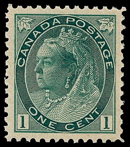 1898, Queen Victoria "Numeral", 1¢ gray green (Scott 75), incredibly well-balanced margins all around, wonderfully fresh color, Extremely Fine, seldom offered with margins this balanced, o.g., never hinged, 2015 P.S.E. cert. graded XF-Sup 95. SMQ XF-SUP 95; $225. Unitrade 75; C$240 ($180). Scott $150. (Image)