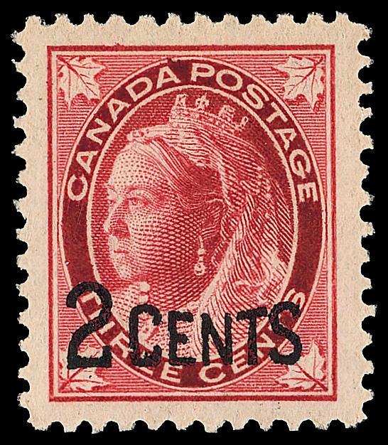 1899, Queen Victoria "Maple Leaf", 2¢ on 3¢ carmine (Scott 87), exceptional centering within balanced "jumbo" margins, vibrant color, pristine, Extyremely Fine and choice, o.g., never hinged, with 2017 P.S.E. certificate graded XF-Sup 95J. Unitrade 87; C$90 ($70). Scott $55. (Image)