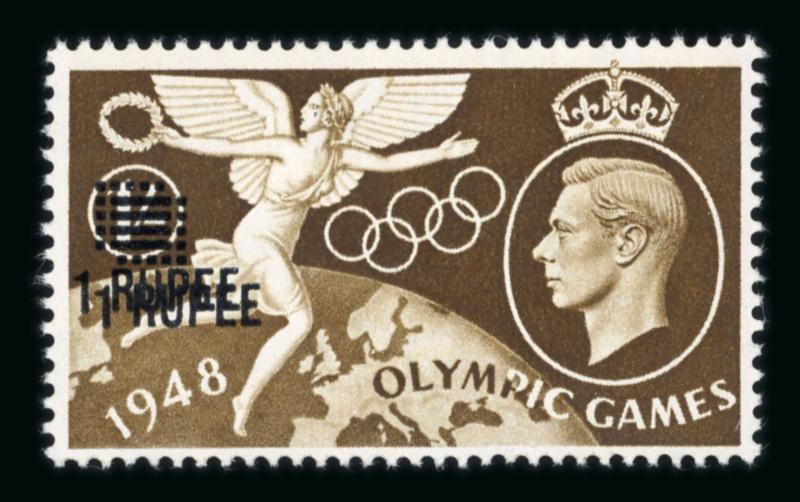 1948 1 rupee overprint on 1/- Olympics brown, overprint doubled, with full original gum unmounted, an extremely rare surcharge variety with a single sheet being produced (SG £1800); with certificate Sismondo 2011 and accompanying expertizing mark on reverse. (Image)