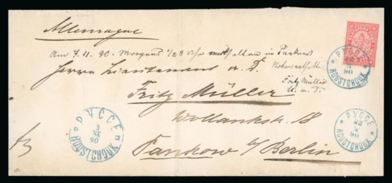 1890, 3rd Issue 10St rose tied to NEWSPAPER WRAPPER by blue "ROUSTCHOUK 22.10.90" cds to Berlin, German Empire. newspaper wrappers are generally scarce on Bulgaria, this particular item of the 3rd issue apparently is unique, cert. G.Todd and N.Penev (Image)
