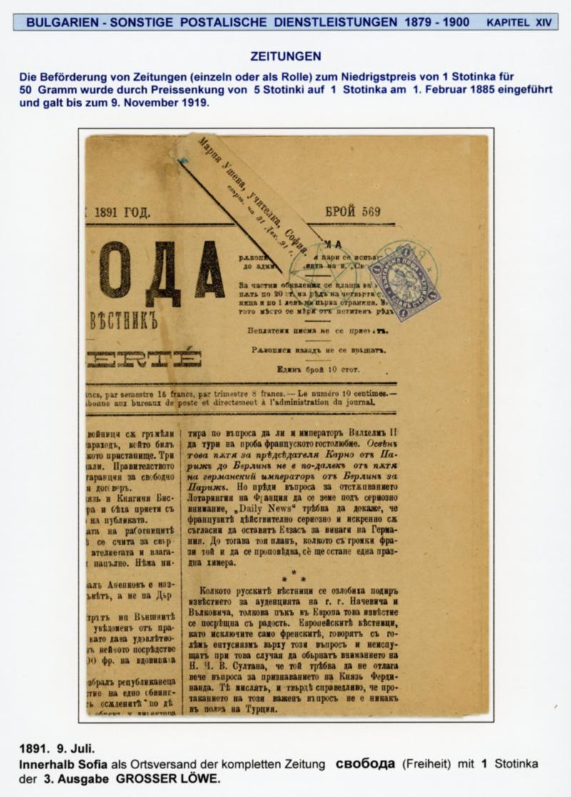 1891-99, 3 different newspapers or magazines showing 3 different tariffs: 3rd issue 1St (minimum tariff for 1 newspaper since 1885) on local newspaper mailing from Sophia, 3rd issue 3St on magazine (special tariff for magazines up to 50gr) and strip of 3 of 3St of 6th issue as incorporate franking on top of 3 newspapers sent to same adress, a rare trio (Image)