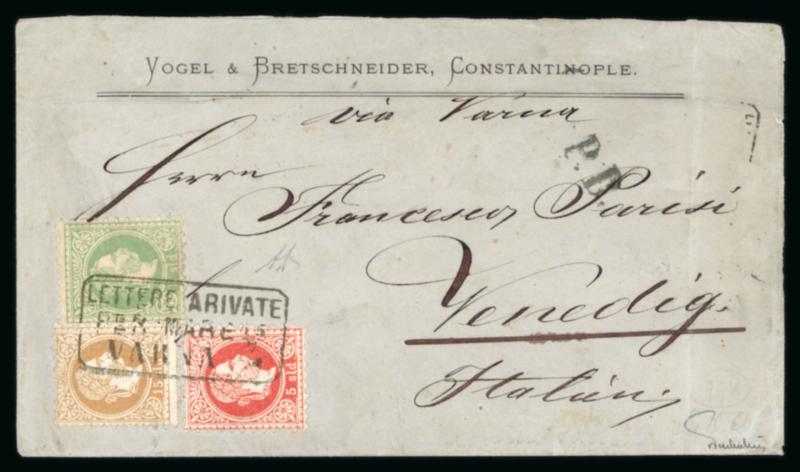 1874, Envelope from Vogel & Bretschneider Constantinople franked 1867 coarse whiskers 3so+ 5so + 15so bearing scarce boxed LETTERE ARRIVATE PER MARE VARNA 15.7. to Venezia, sign. Diena, cert Ferchenbauer (Image)
