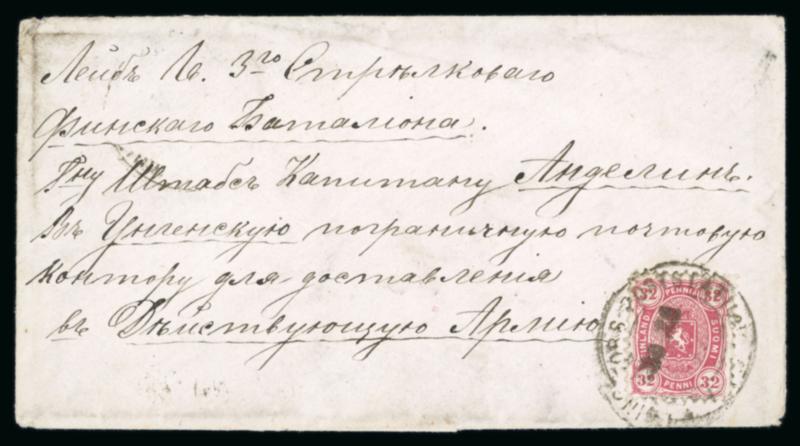 PARTICIPATION OF THE FINNISH BATTALION - INCOMING MAIL: Envelope from Finland franked 32p postmarked HElSINGFORS POSTSTATION 30.11.77, addressed to a staff captain Andelin of the 3rd Finnish Infantry-Battalion via St.Petersburg 18/19 Nov. at border post station Ungeni to be forwarded to the fighting army (which at this point was already heavily engaged in the fights around Pleven), a very rare item (Image)